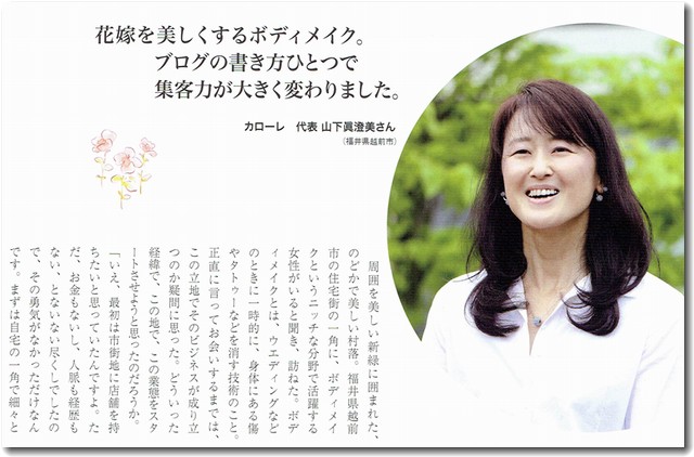 また、「のれん」のセンター見開きでは福井県越前市でブライダルボディメイクサロンを運営する山下眞澄美氏が紹介されている。これも好記事で、ブログで情報発信することにより新規問合せを多数もらえるようになりビジネスが軌道にのったというストーリーには注目したい。北陸から多数の成功事例としての紹介者がでるのはうれしいものだ。