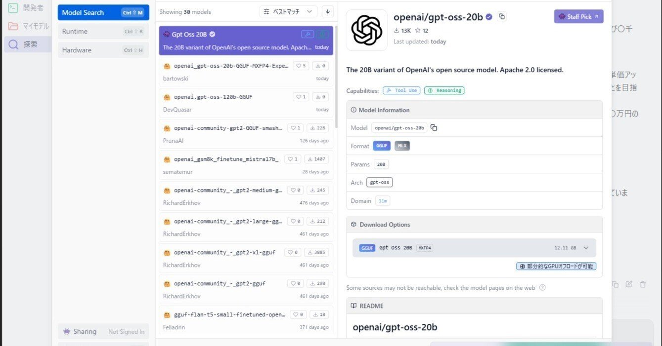 「gpt-oss-20b」は12.11GBなので、メモリ32GBを積んでいる私のノートPCなら一応は動きます。(遅いかもしれませんが…)