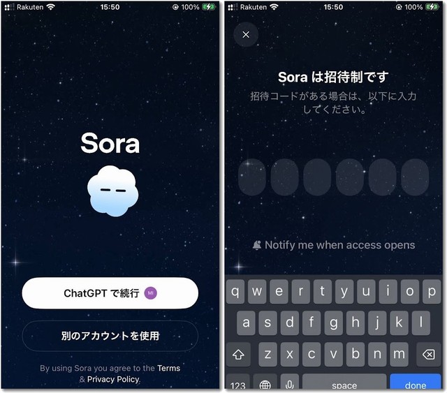 現在は招待コードがないとsoraアプリを使えません。私は運よく招待コードをゲットできました。