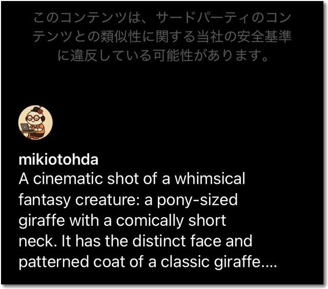 「首の短いキリン」の動画生成動画生成AI「Sora」が世界に衝撃を与えてから、しばらくが経ちました。私もその驚異的な性能に魅了され、様々な動画生成を試みています。しかし本日、ごく普通のプロンプトで動画を作ろうとしたところ、思わぬ「壁」にぶつかりました。
