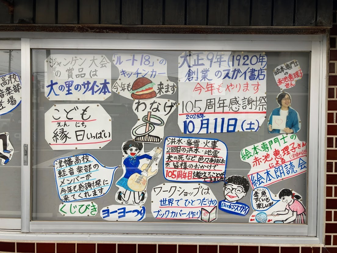 2025年10月11日(土)に、石川県津幡町にある老舗書店「スガイ書店」が開催した創業105周年記念イベントにお邪魔してきました。昨年の104周年イベントに引き続きの参加となりましたが、今年もまた、多くの地域の方々で賑わう店内の様子に、胸が熱くなるのを感じました。