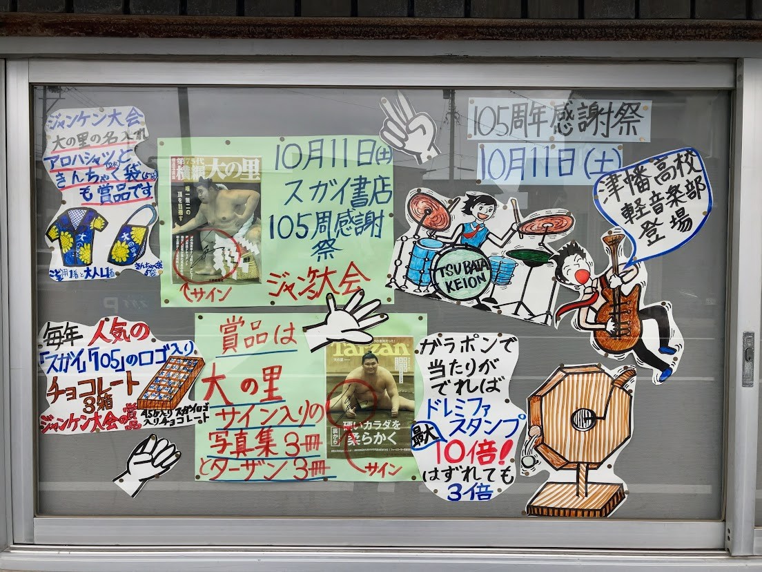 スガイ書店は、大正9年(1920年)創業。なんと105年もの歴史を持つ、津幡町にとってなくてはならない存在です。私がお店に到着すると、まず目に飛び込んできたのは「祝105周年」と書かれた手作りの温かいメッセージでした。