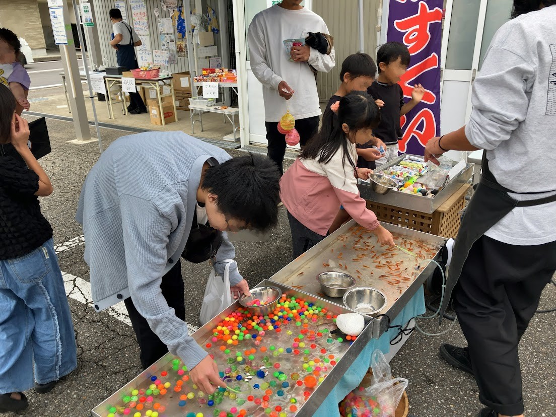 店舗横イベント会場に入ると、そこはすでにお客様の熱気で満ちあふれていました。子どもたちの楽しそうな声、そして大人たちの笑顔。風船で飾られた店内は、まさにお祭り一色です。