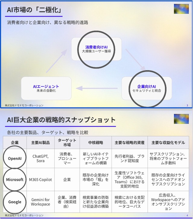 もう一つは、「ビジネス用途」としてのAIです。 こちらは、MicrosoftのCopilotやGoogleのGeminiのように、既存のビジネスプラットフォームに組み込まれる形で進化していく流れです。企業活動においてAIを活用する上で最も重要になるのが、「利便性」と「データのセキュリティ」の両立です。ビジネス用途のAIは、企業の機密情報や顧客データを安全に守りながら、業務効率を劇的に向上させる方向で発展していくでしょう。