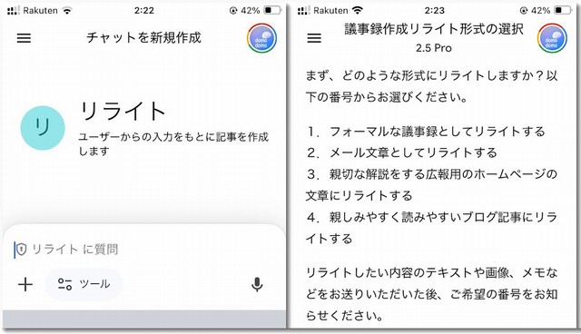 私はGeminiにリライト専用のAI(カスタム指示)をセットしています。そのため番号を選ぶだけで、目的に合ったドキュメントを生成できるようにしています。
