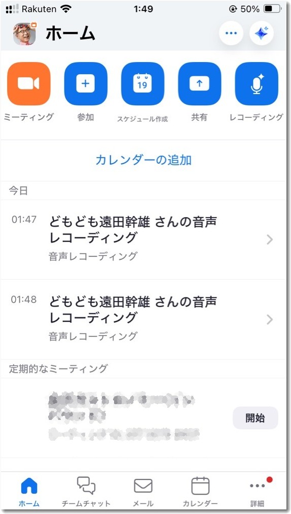 会議終了後には、ホーム画面にレコーディングデータが記録として残ります。