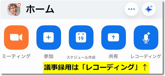 - 「レコーディング」をタップして、自分一人のオンライン会議を開始します。