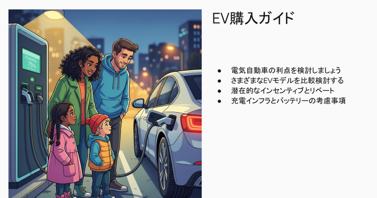 これは実際に「電気自動車について説明して」というプロンプトで生成された1枚のスライドです。