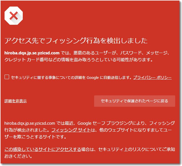 このように警告がでるようになると、WEBサイトにアクセスすることができないので被害は未然に防止されるようになる。しかし、このような警告がでるまでにはすでに多数の被害者がでているはずである。そして、悪意を持った運営者は、このWEBサイトが使えなくなったら、また別のWEBサイトを使って同様の行為を繰り返すだろう。