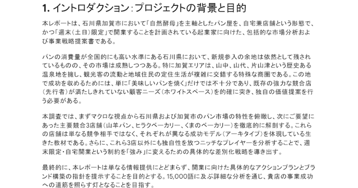 石川県加賀市における週末限定・自然酵母ベーカリー開業に向けた包括的市場調査および戦略提案書 1. イントロダクション:プロジェクトの背景と目的 本レポートは、石川県加賀市において「自然酵母」を主軸としたパン屋を、自宅兼店舗という形態で、かつ「週末(土日)限定」で開業することを計画されている起業家に向けた、包括的な市場分析および事業戦略提案書である。 パンの消費量が全国的にも高い水準にある石川県にお...