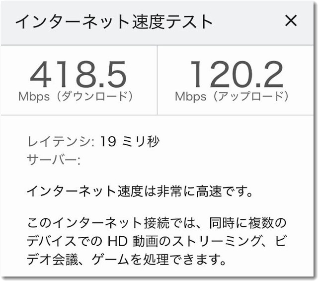 雪の降る悪天候の中、これだけの速度が出れば文句なしです。 ルーターのある母屋の室内では400Mbps程度なので、屋外を挟んで約半分の速度が維持できていることになります。非常に優秀な結果と言えます。