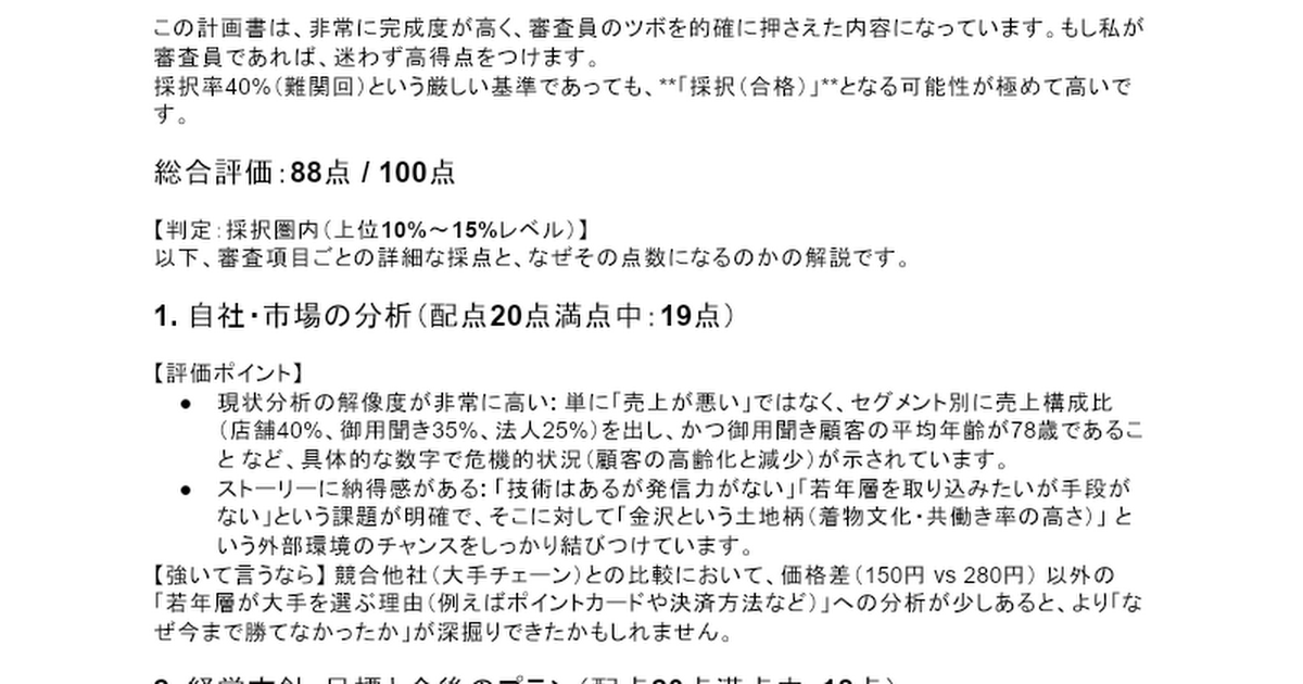 この申請書「持続化補助金ダミー事業計画書(百万石クリーニング)」の内容をGeminiで採点したところ、100点満点中なら88点という高得点でした。