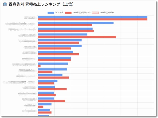 • 得意先別 累積売上ランキング:上位の得意先ごとの売上を、今年度と前年度(同月まで/以降)で色分けして比較できる横棒グラフを実装しました。どの顧客が成長しているかが視覚的にわかります。