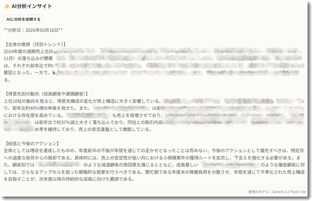 集計した数年分のデータをGemini APIに送信し、プロの経営コンサルタントの視点で分析・要約させます。