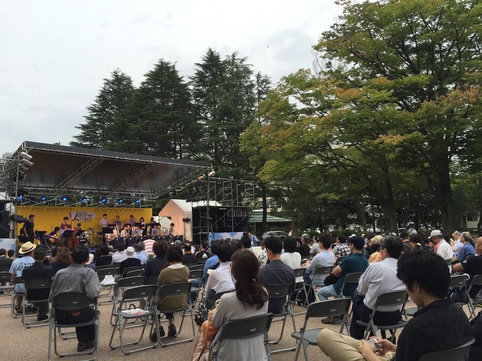 四高記念公園はジャズストリートのメイン会場としていいステージが多数繰り広げられていた。どのグループもライブの持ち時間は小一時間で15分程度の小休止中に次のグループが入れ替えになる。観る側としてはスピード感があって、複数の会場を巡回するのも楽しい。
