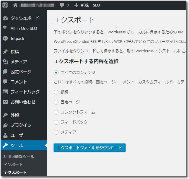 管理画面でツール→エクスポートを開くと「エクスポートする内容を選択」という画面が表示される。すでに「すべてのコンテンツ」が選択されているはずなので、そのまま「エクスポートファイルをダウンロード」をクリックする。
