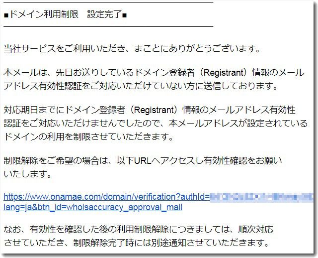 対応期日までにドメイン登録者(Registrant)情報のメールアドレス有効性認証をご対応いただけませんでしたので、本メールアドレスが設定されているドメインの利用を制限させていただきます。