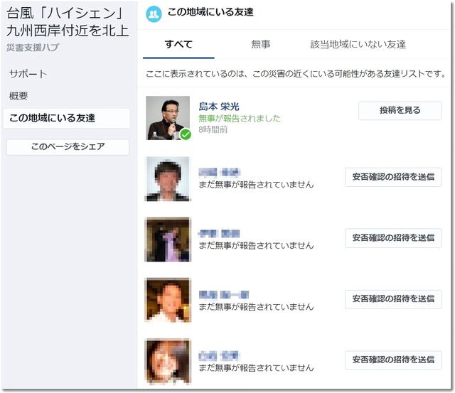 個別に安否を尋ねることも可能ですが、ご本人からするとそのような情報が殺到しては日常生活に弊害になりかねません。自然に知らせてくれるこのような情報サービスには好感が持てます。SNSで個人情報のポータルサイトとしての役割がこういうときにわかりますね。