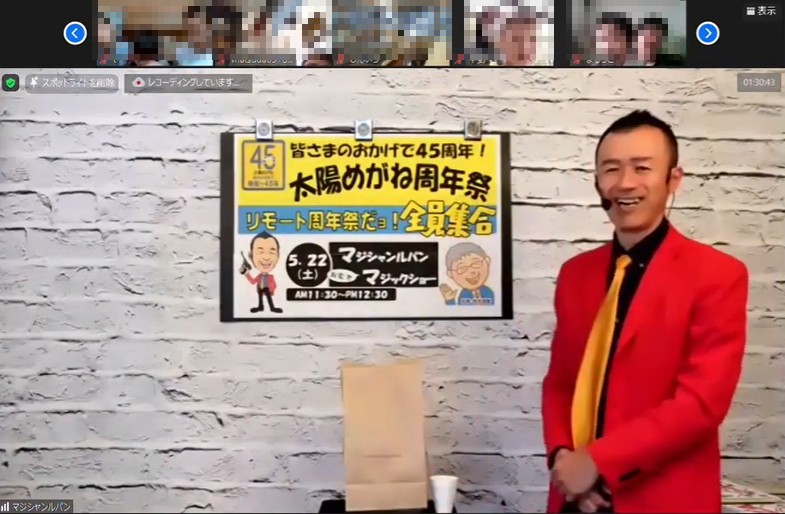 太陽めがねさんの45周年イベントが開催されました。リモートだよ全員集合!ということでオンラインマジックショーをZOOMで実施しました。多数の参加があり、ZOOMだけでこれだけ楽しめるんですね、っていうくらい工夫されていて、とても楽しめました。